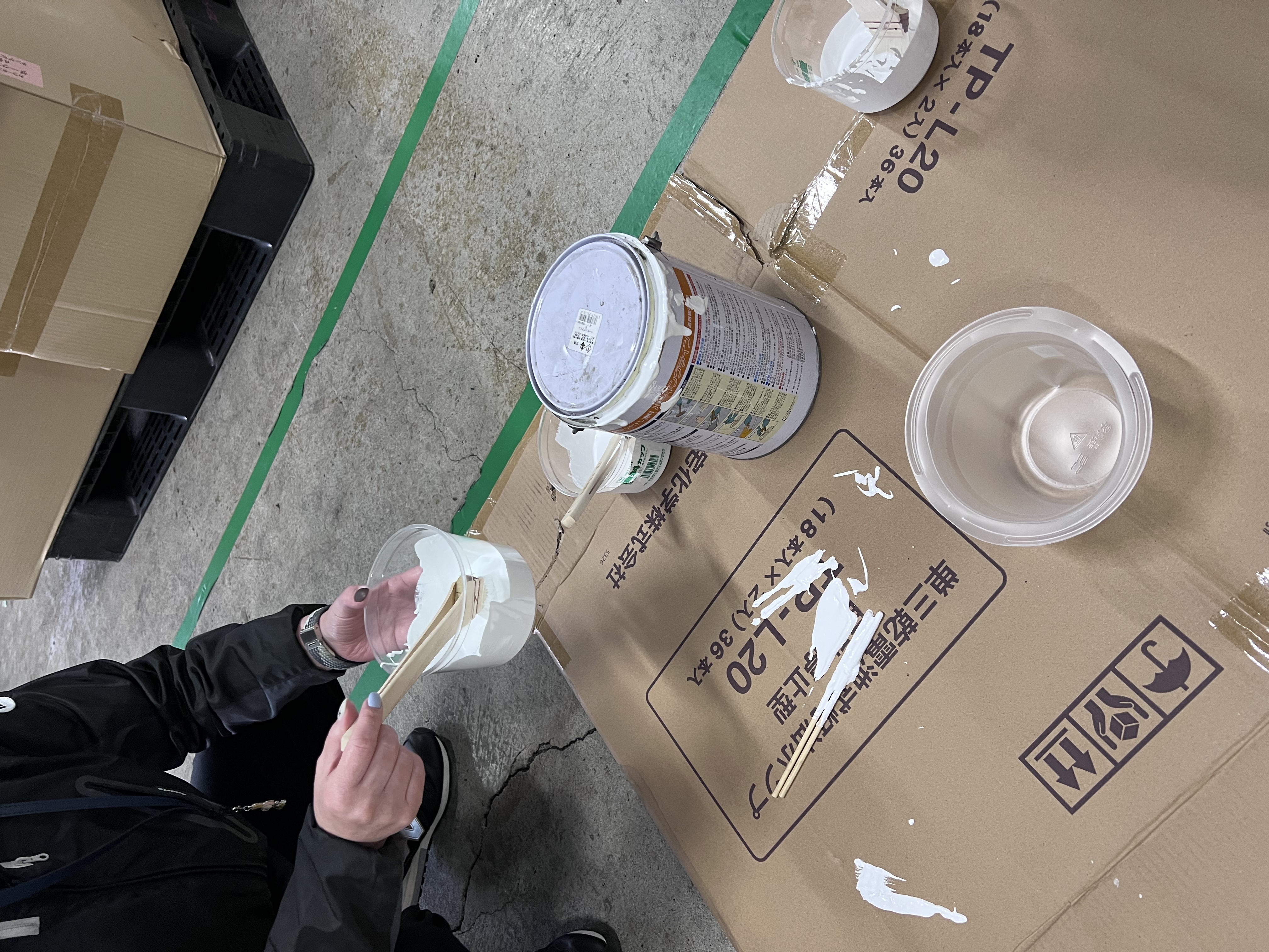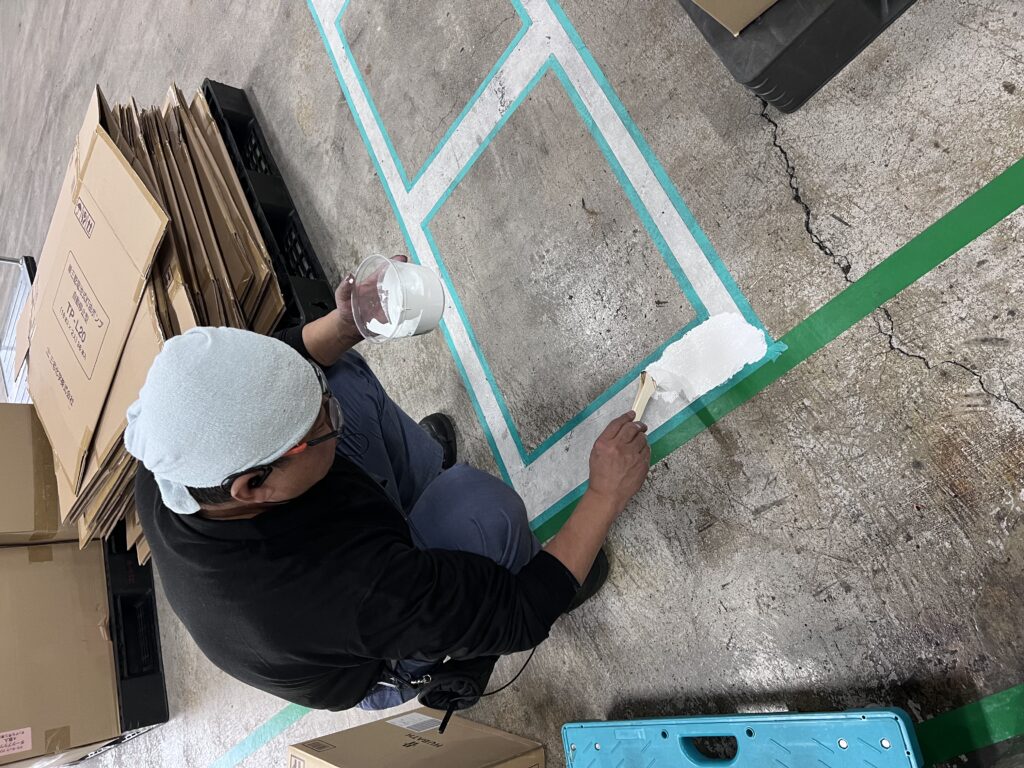 以前はフォークリフトとの接触を避けるため、テープで歩行帯を作成しました。しかし、時間が経つとどうしても剥がれてしまうため、今回は思い切って ペンキで歩行帯を塗装 することにしました!